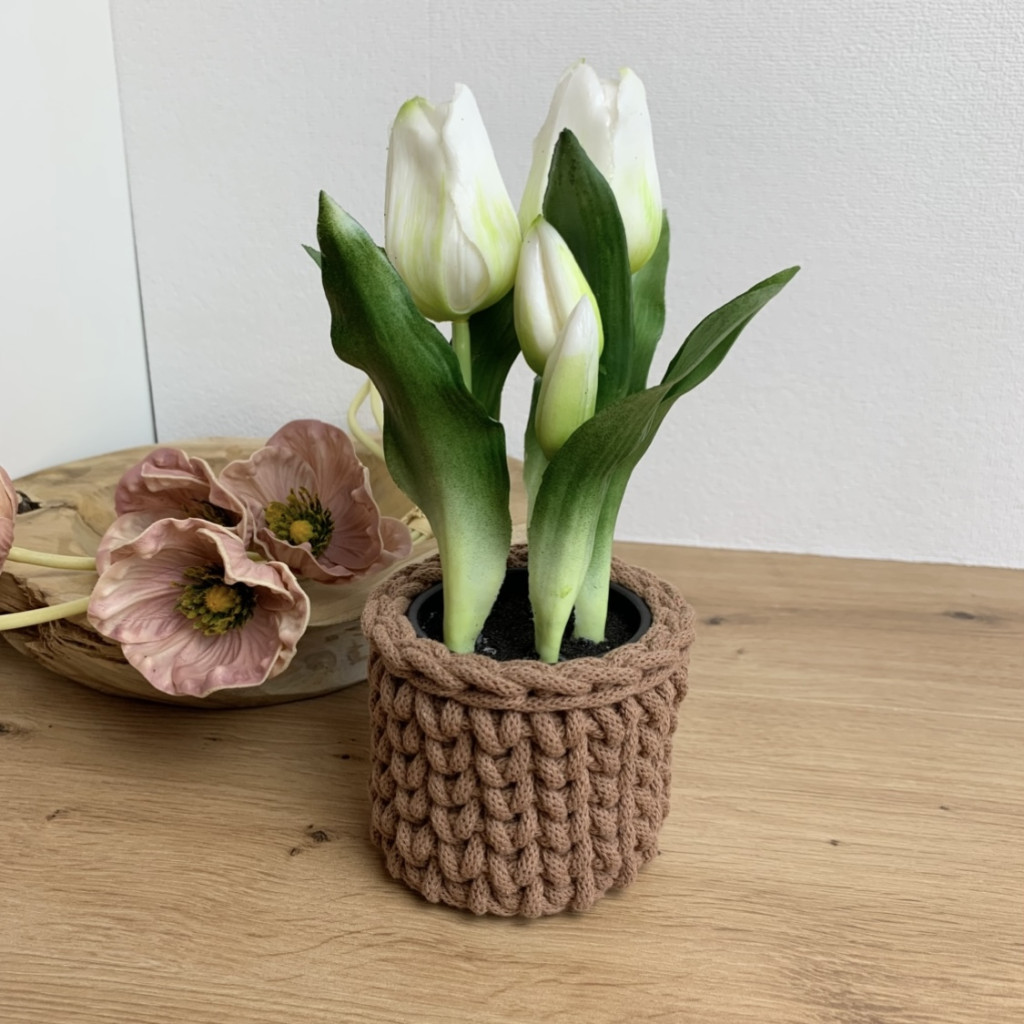 Az élethű tulipánok egy kézzel horgolt kaspóban kaptak helyet, amely még különlegesebbé teszi az egész kompozíciót.