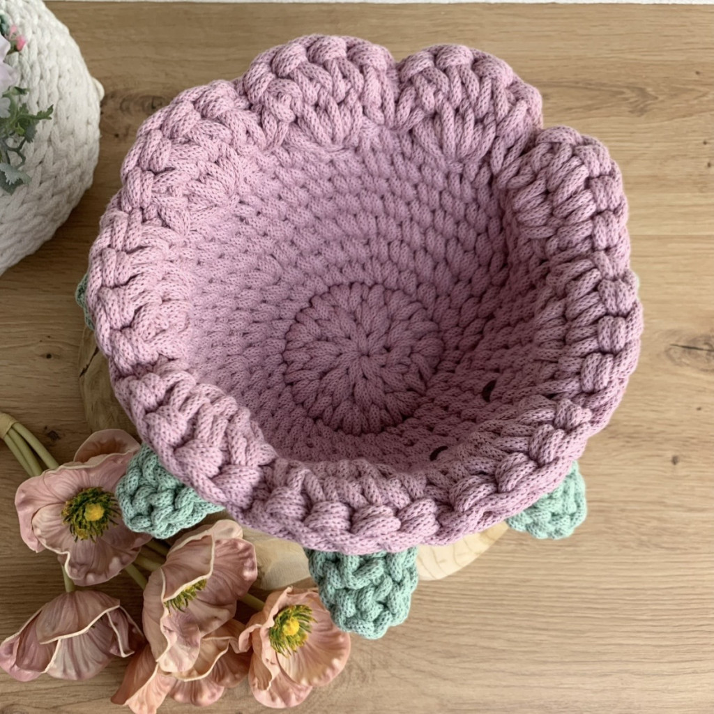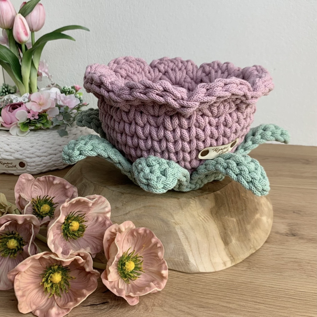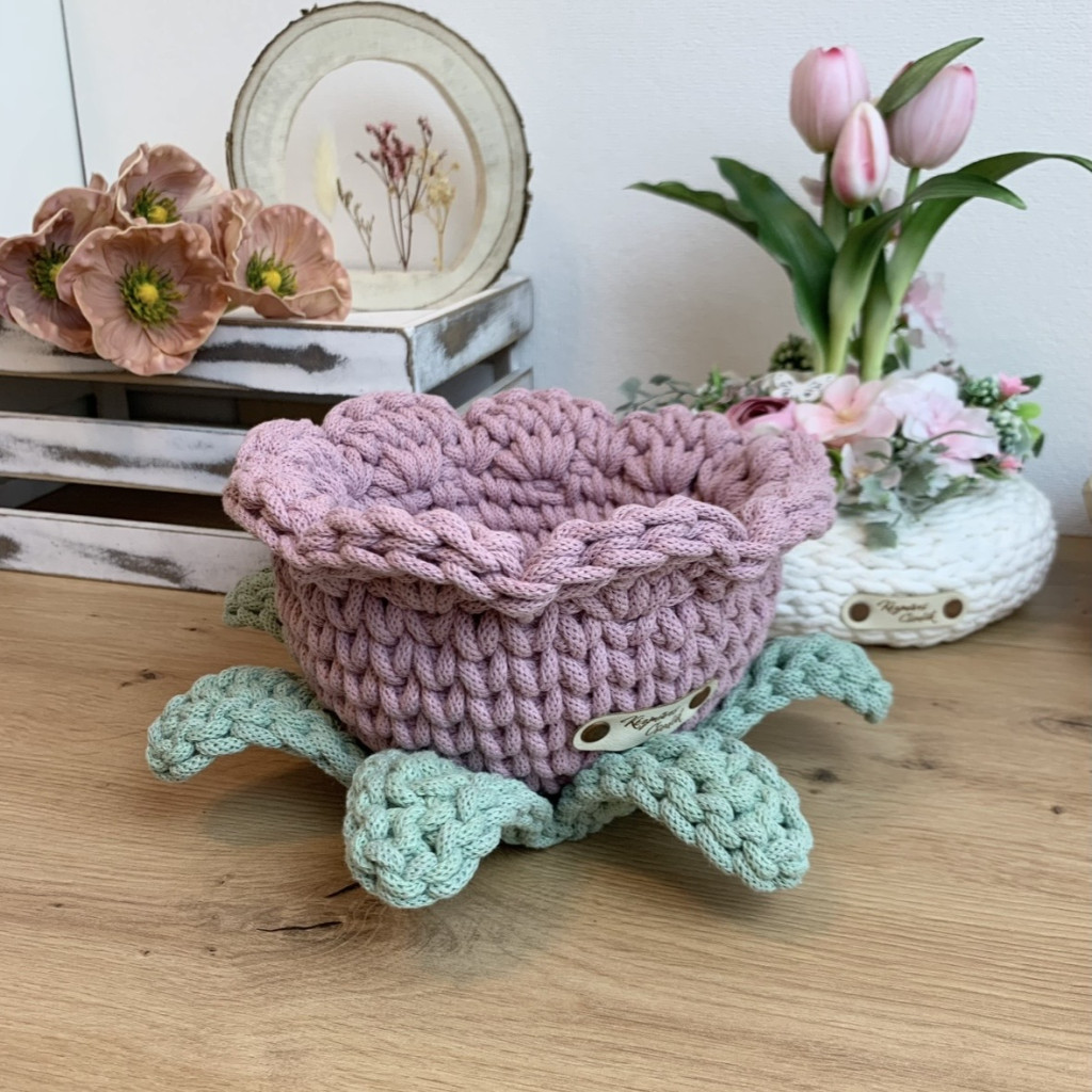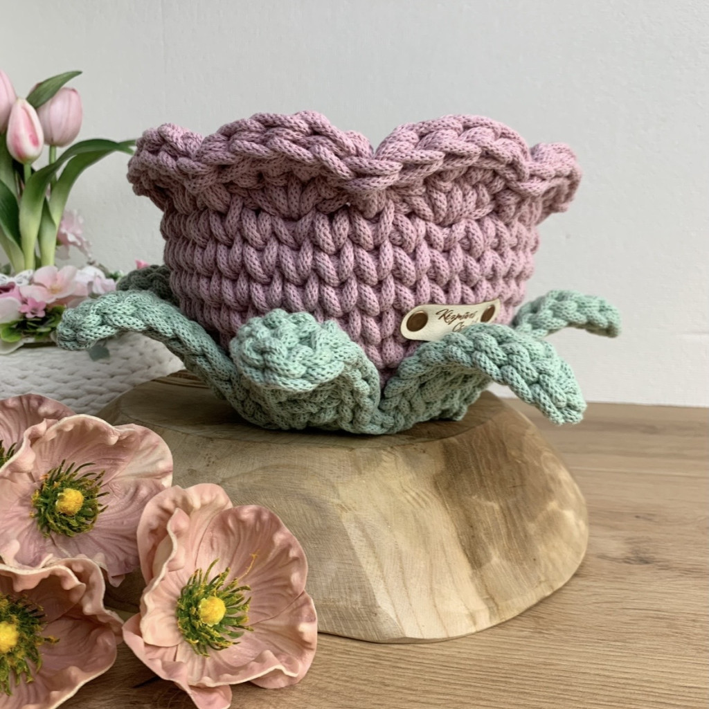 Ez a kézzel horgolt, virág formájú tároló kosár a virágos kollekcióm legújabb darabja – és talán az eddigi legkülönlegesebb is. Nemcsak a szirmai kaptak hangsúlyt, hanem a finoman kidolgozott levelek is, amelyek még élettel telibbé és játékosabbá teszik az összhatást.