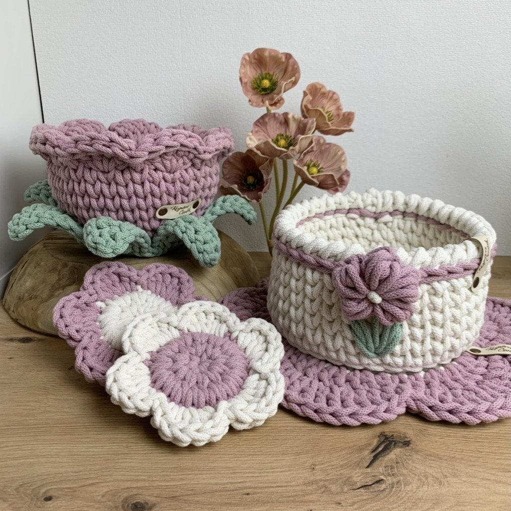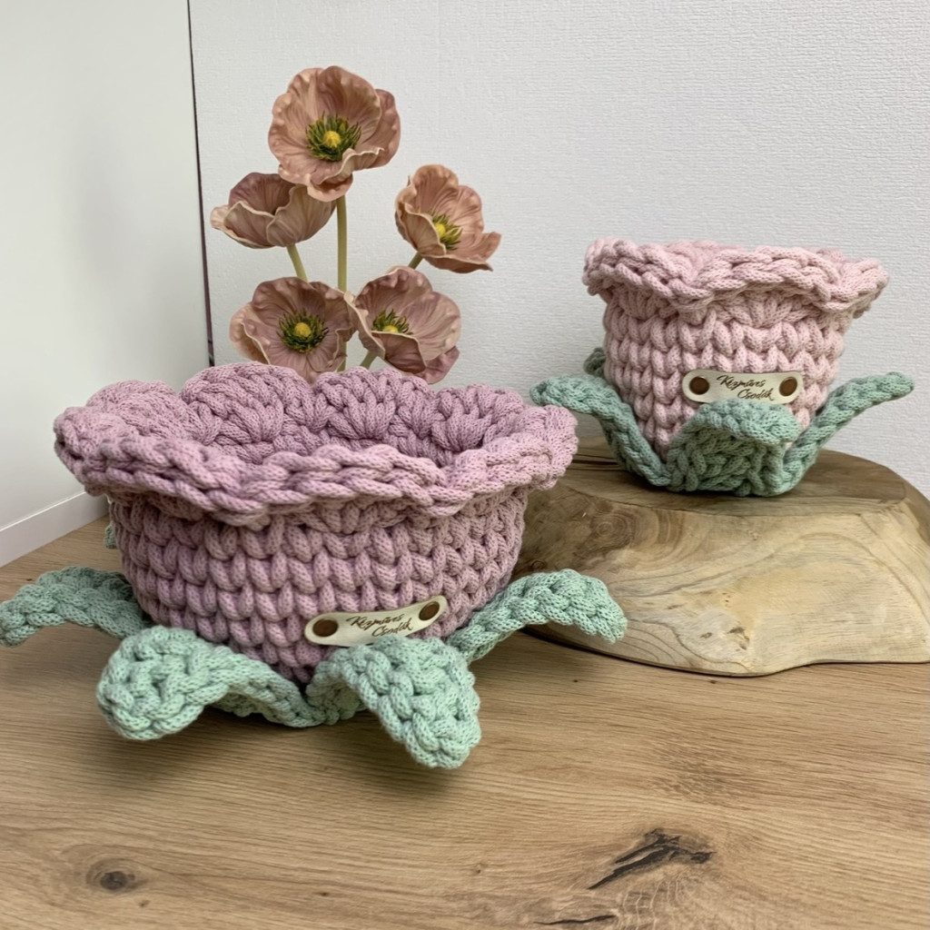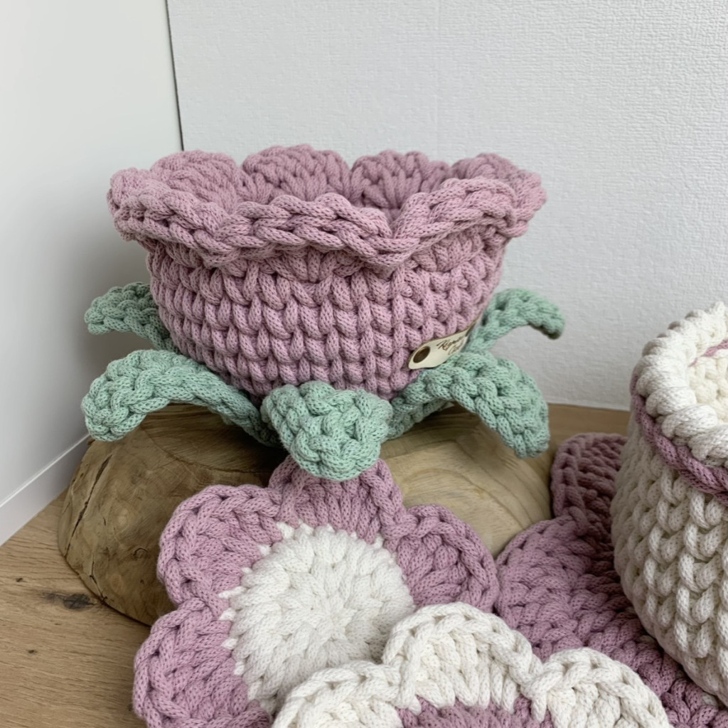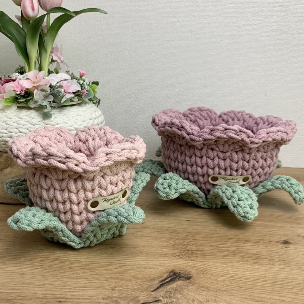 Ez a kézzel horgolt, virág formájú tároló kosár a virágos kollekcióm legújabb darabja – és talán az eddigi legkülönlegesebb is. Nemcsak a szirmai kaptak hangsúlyt, hanem a finoman kidolgozott levelek is, amelyek még élettel telibbé és játékosabbá teszik az összhatást.